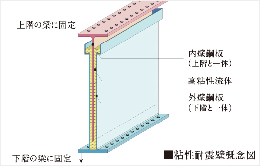 高粘性流体の粘性抵抗力を利用した壁状の制振部材。建物中央部分に配置しています。
