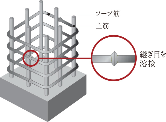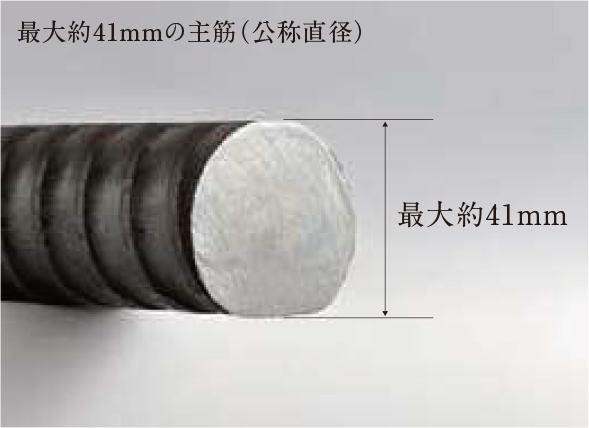 主要な柱の鉄筋には、最大約41mmという太さの主筋を採用。さらにフープ筋には、地震時により大きな変形が生じた場合でも耐力低下が小さい、鉄筋の継ぎ目を溶接した溶接閉鎖型せん断補強筋を採用。これらの鉄筋により柱の耐震性をより向上させています。