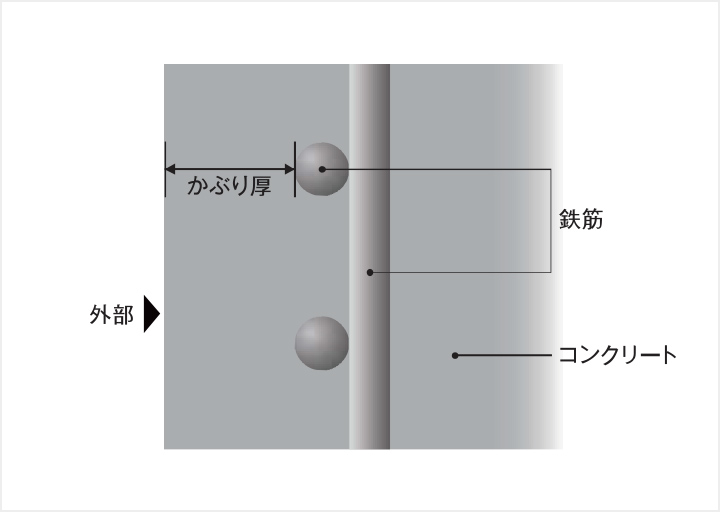 コンクリートは空気に触れると外側から徐々に中性化するため、中性化が鉄筋に至ると錆が発生して耐久性を損ないます。そこで構造体コンクリートについては、鉄筋を覆うコンクリートのかぶり厚を適切な寸法とすることで耐久性を高めます。