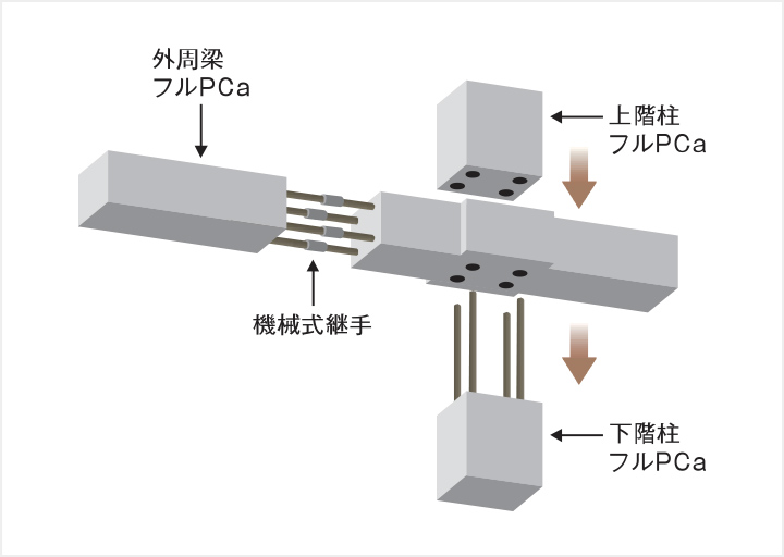 あらかじめ工場で製造した鉄筋コンクリート部材を用いるプレキャスト(PCa)工法。寸法誤差が少なく精度の高い施工が可能です。「Brillia Tower 堂島」では構造架構の多くにプレキャスト工法を採用し、高精度な柱と梁を採用しています。