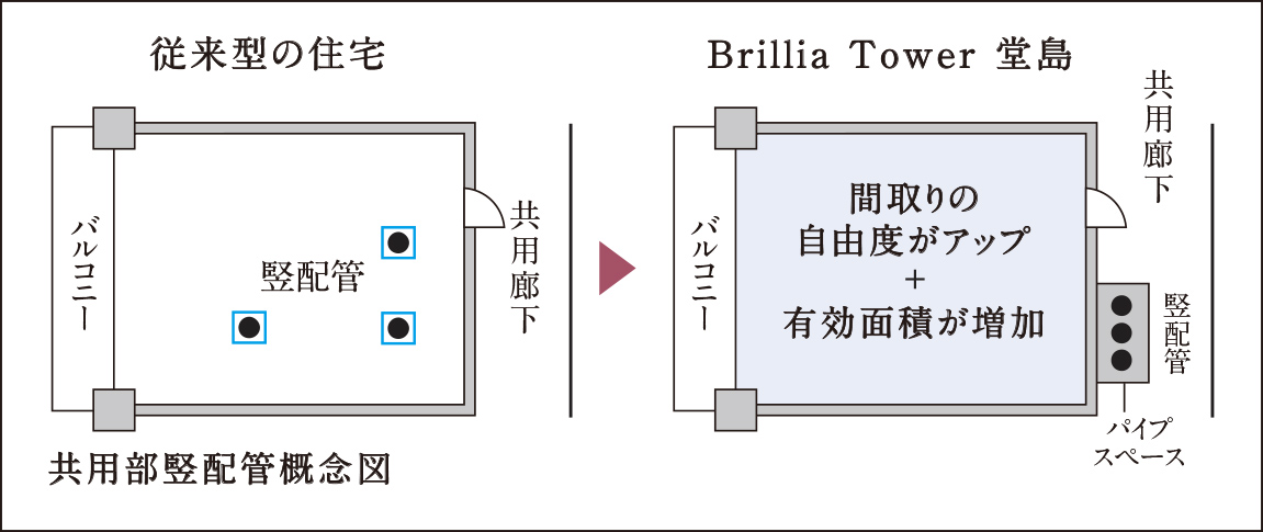住戸内に上下に貫通している竪配管を住戸外に設置することにより、将来間取り変更の際に自由度が高まるとともに、メンテナンスがしやすい設計としています。