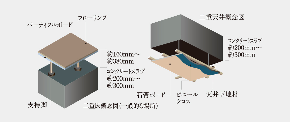 スラブと床材の間に空気層を設けることで高い防音効果をかなえる二重床。天井はメンテナンスやリフォームを容易にする二重天井※としています。