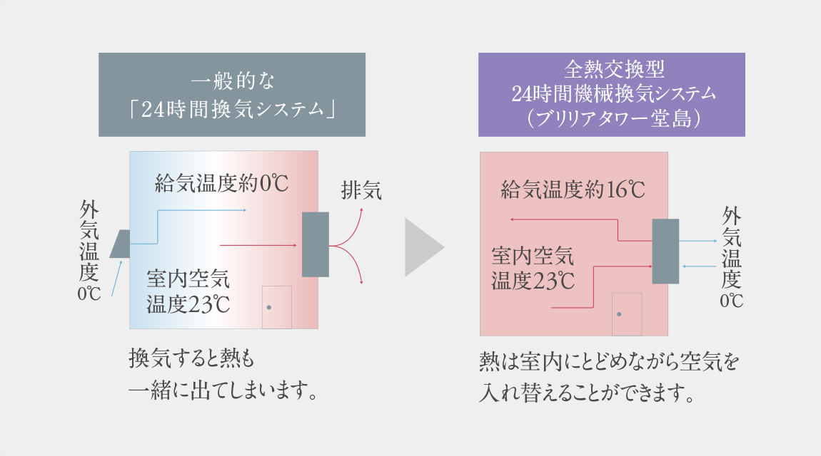 内外の温度差によるヒートショックを緩和する部屋内の快適性と、換気に伴う空調エネルギーロスを大幅に低減するロスナイ(静止形全熱交換形換気機器)を全住戸に採用。換気の際に排出する室内空気の熱を利用して、外気の温度を室内の温度に近づけてから取り込み、冷暖房効率を高めます。