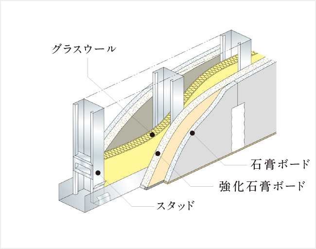 国土交通省認定の乾式耐火遮音戸境壁を採用。硬質石膏ボードの間にグラスウールなどを入れ、耐火性とともに高い遮音性を保つことで、隣り合う住戸への生活音の伝わりを軽減しています。
